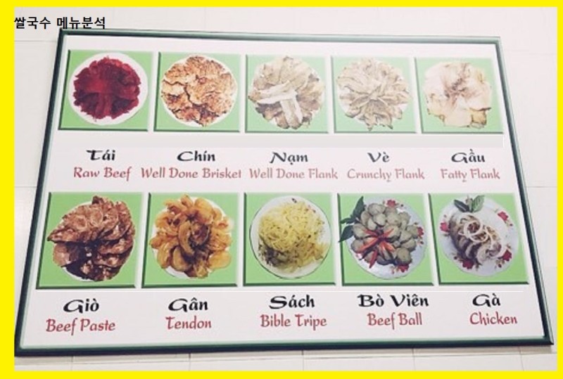 베트남 쌀국수는 메뉴판 사진과같이 고기 부위에 따라 메뉴명이 정해진다. Pho Tai, Pho Chin과 같이 말이다.